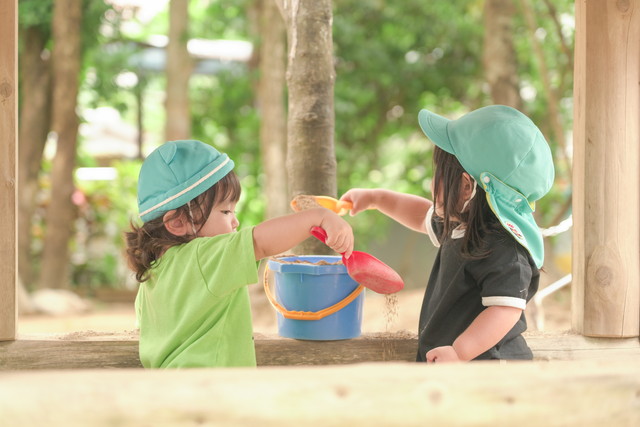周囲の人(保護者、保育者、子ども達、地域の人たち等)や自然など環境に関わりながら、子どもが自分から遊びを見つけ、工夫し、創造力を働かせて遊びこめる保育を基本とします。